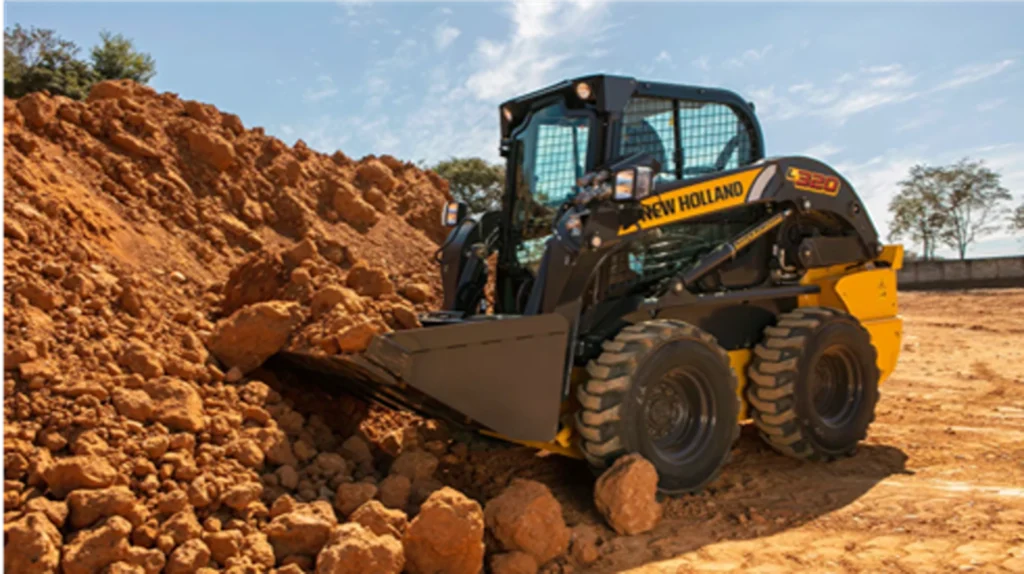 A minicarregadeira é um equipamento compacto que lembra um trator de pequeno porte, principalmente por contar com uma pá carregadeira